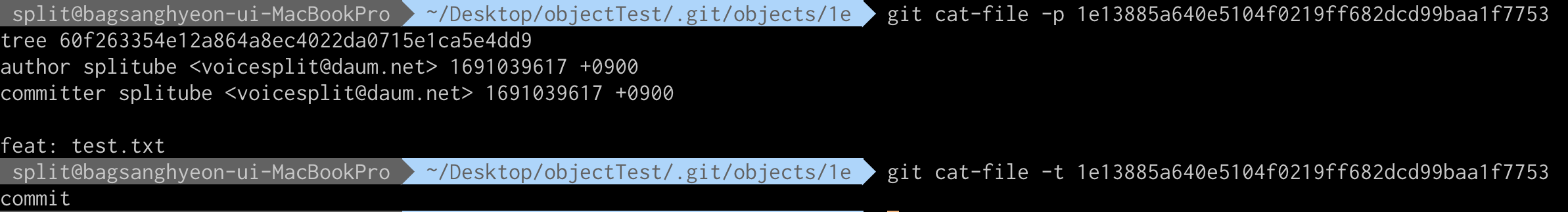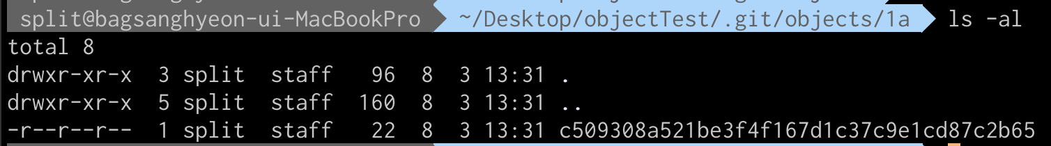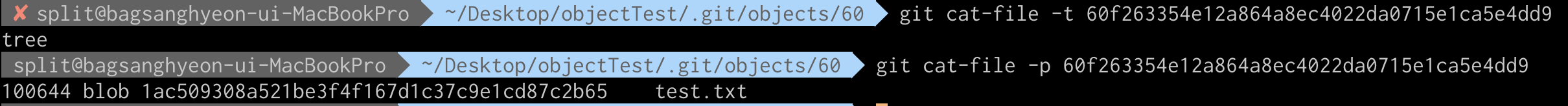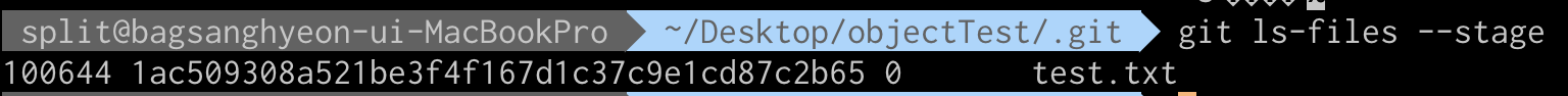 test.txt 개체의 hash값을 볼 수 있다. (1ac509308a521be3f4f167d1c37c9e1cd87c2b65 )