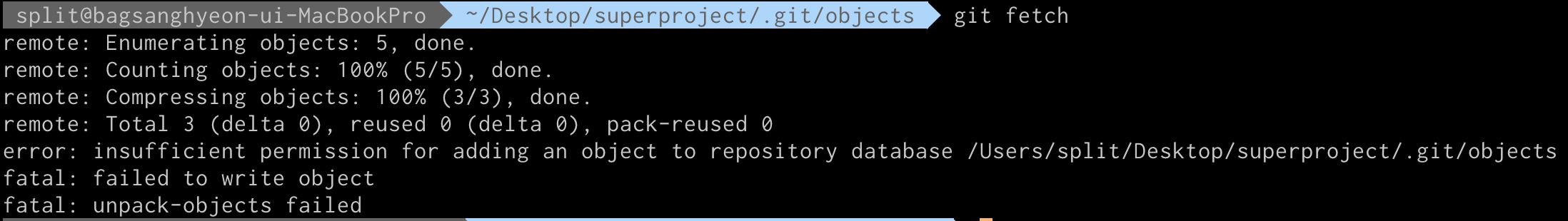 이 과정이 git pull의 git fetch 에서 발생했고 그렇다면 원격저장소에 받은 pack 파일을 로컬저장소에서 사용하기 위해서 unpacking 하는 과정에서 권한이 없어 실패했을 것이다.
